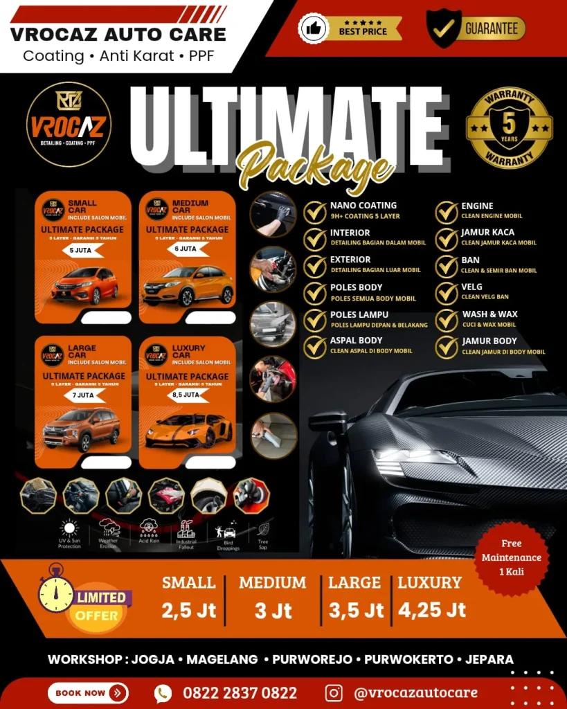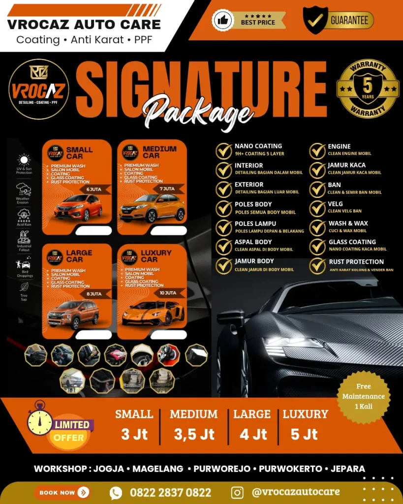 Vrocaz Jepara melayani Detailing, Coating, Rust Protection, Kaca Film, Cover Mobil & Motor Untuk memenuhi layanan pelanggan di wilayah Jepara, Kudus, Rembang dan sekitarnya